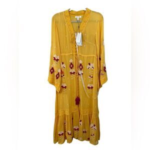 You have every reason to smile in this truly unique vintage-inspired boho-style midi dress! Crafted from a cheerful yellow-hued, lightweight woven fabric and adorned with beautifully embroidered pink and white flowers scattered throughout the front and along the sleeves and tiered hem with white polka-dots throughout, this flowy dress is full of lovely eye-catching detail.