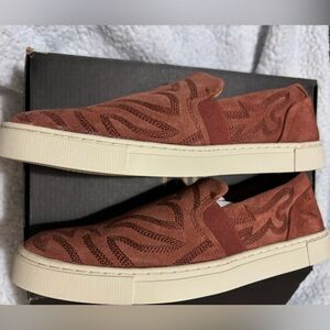 NWT Frye beautiful & unique women’s size 7 M. Very stylish design & soft suede slip-on shoes. Perfect for any casual occasion.