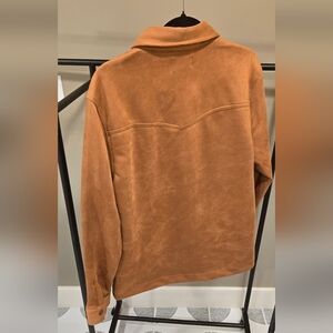 Stylish men's tan faux suede jacket in color Toffee. Perfect for any occasion. Features a classic design with a comfortable fit. Snap button closure