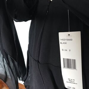 Adorable & flirty size 2 black ruffle skirt by 148 Lafayette New York. Has a long tie on the side that can be tied traditionally on the side in a knit or bow. Or can offer a more completely different sexy wraparound look. Hidden side zip & clasp closure, both functional. This skirt is new with tags, has a few very tiny spots as shown, but aren’t visible when worn, & do not take away from the integrity of this amazingly beautiful skirt. Has no other known blemishes. Comes from a smoke free home.