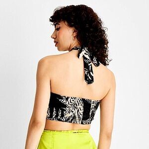 new with tags, Future Collective, Alan, women’s crop top, botanical print, halter neck, tie-front, summer fashion, trendy, stylish, breathable fabric, versatile, tropical, black and white, casual wear, festival outfit, beachwear, chic, high-waisted, snug fit, comfortable