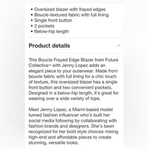 This Boucle Frayed Edge Blazer from Future Collective™™™ with Jenny Lopez adds an elegant piece to your outerwear. Made from boucle fabric with full lining for a chic touch of texture, this oversized blazer has a single front button and two convenient pockets. Designed in a below-hip length, it's great for wearing over a wide variety of tops.