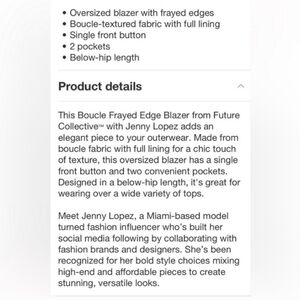 This Boucle Frayed Edge Blazer from Future Collective™™™ with Jenny Lopez adds an elegant piece to your outerwear. Made from boucle fabric with full lining for a chic touch of texture, this oversized blazer has a single front button and two convenient pockets. Designed in a below-hip length, it's great for wearing over a wide variety of tops.