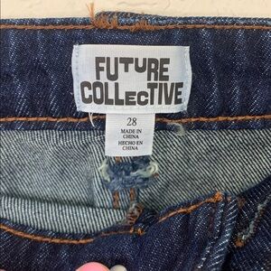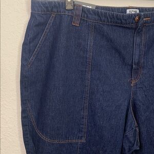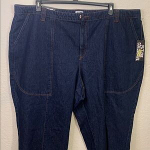 Fun and stylish dark blue denim jeans with a straight leg cut and high waist. Button-flap back pockets, pork chop front pockets. Orange stitching. Perfect for casual wear, work, or everyday.