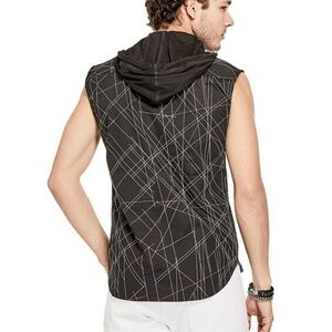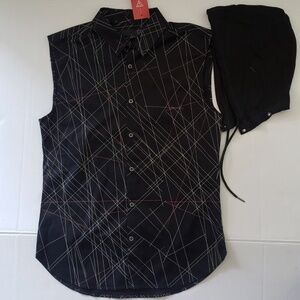 Get a laid-back look in this poplin shirt featuring a contrast hooded top, an allover geometric print, drawstring ties and a sleeveless design. Front button closures.