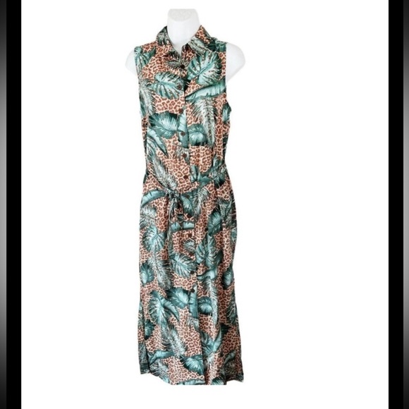 ✨NWT G By Guliana Tropical cheetah Green Sleeveless Dress button down tie waist
