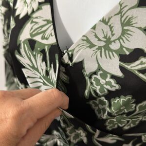 Neckline: Crossover V-neck with hidden hook-and-eye modesty clasp