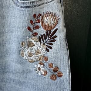 Design details: Medium-light wash, floral embroidery at front pocket, detailed stitching along both hems, raw edge finish, wide leg crop silhouette