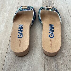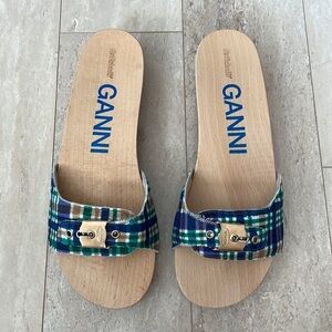 NWT GANNI x Dr. Scholl's Plaid Wooden Clog Sandals Buckle Retro Slides Blue 9