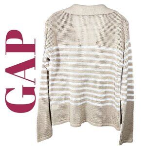 NWT GAP 100% Cotton Coastal Classic Tan White Striped Collar Preppy V-Neck Sweater, Size Medium