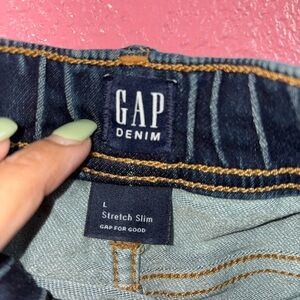 Experience timeless style with these GAP blue jeans, featuring a classic straight-leg cut and a medium wash. The denim showcases natural fading and whiskering for a worn-in look, while the regular rise ensures a comfortable fit.