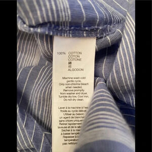 GAP Hi-Low Boyfriend Button Down Shirt in Blue Stripe. Collar. Foldover front chest pockets. Pearl colored buttons down the front. Button flaps at the elbow to roll up the sleeves and make a cute cuff for adjusting sleeve length. Loose fit and lightweight, perfect alone or for layering. Varying horizontal stripes.