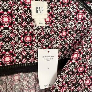 GAP women’s long sleeve geometric print romper in black, pink and white. Size large.