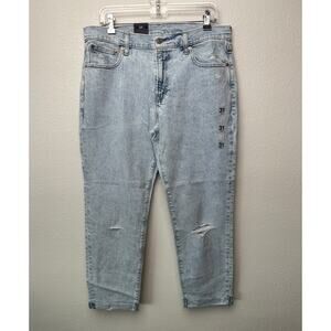 Classic five-pocket jeans in a light stone/acid-wash finish with raw hems for a worn-in look. The Girlfriend silhouette sits mid rise with a relaxed, tapered leg that pairs easily with tees, sweaters, and sneakers. Features zip fly with button closure, belt loops, and subtle knee distressing. A versatile everyday denim option from GAP.