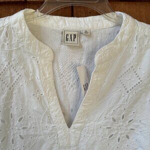 Brand new with tags and never worn! White Eyelet GAP Cotton A-Line Dress in Women's X-Large - Breezy in eyelet fabric, GAP's three-quarter sleeve cotton shift dress features a tiered skirt for a sophisticated, feminine silhouette.