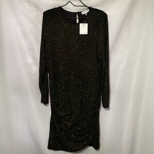 NWT GIBSON *LATIMER WO SIZE XXL COCKTAIL PARTY SHEATH DRESS BLACK GOLD GLITTERY RUCHING AT BOTTOM SIDES LONG SLEEVE LINED OFT SHOULDER PADS LENGTH MEASURES APPROX 40”FROM SHOULDER TO HEM SLEEVES MEASURE APPROX 15” CHEST MEASURES APPROX 24” from side to side