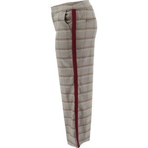 Features: allover plaid pattern, functional slash front pockets, faux welt back pockets, solid stripe side seam detail, pressed pleat on center front leg