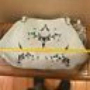 Double handles, removable shoulder strap, large suede tassel, top snap closure, embroidered design, clasp to adjust silhouette, goldtone hardware