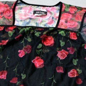 New with tags still attached, Amy Byer ankle-length girl's size 16 dress of black illusion over black polyester satin. Both liner and illusion printed with red roses that cluster on bodice and bottom third of skirt. Combination of images gives 3-D effect. Liner comes up to form square neck while shoulders and short sleeves are illusion only. All edges of bodice and sleeves bound in black. Designed for easy comfortable fit, no-waist dress measures 38" all way from chest to bottom.