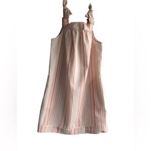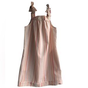 This girls “pillow case dress” is simple yet so adorable for the summer. Striped in colors of beige/tan, mauve, orange, and white, tying bows at shoulders.