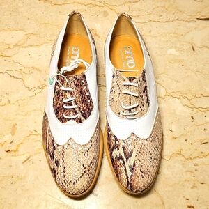 NWT | GMD | Womens Lace-up Brown, Tan, and White perforated leather & Snakeskin high quality Wingtip Oxford Shoes | Made in Spain | 1" heels | New without box | Size EU 39 - US 8