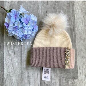 This is by Adrienne Landau and its a Color Block Knit Beanie/Hat with stunning Crystal Details and a fluffy pom pom.