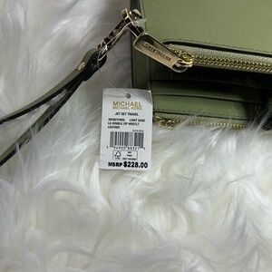 Brand new with tag Michael kors LIGHT SAGE green leather double zip wristlet. Has removable strap. And can hold 6 cards and one window pocket, has a phone pocket and 2 zipable pockets, 2 slip pockets and one big pocket that is the size of the wallet.