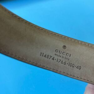 Belt is made of patent leather and feature on interlocking gold toned G buckle