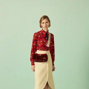 New color and material combinations appear throughout this collection, giving the House's most emblematic styles a precious touch. This striking Ophidia handbag, which makes a meaningful gift celebrating love, is transformed with an array of sparkling red sequins and further enriched with a playful strawberry hardware.