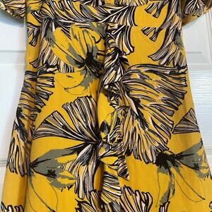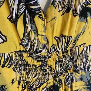 GUESS Dress - Knee length, cascade front, V-neck front & back, smocked elastic at back, short sleeve, ruffle bottom, lined, back zipper. Yellow with palm leaf print.