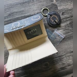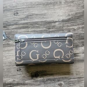 NWT GUESS Logo Monogram Brown And Tan Wallet, new with tags, comes with extra gems and a small Keychain mirror, height 4 inches, width 7 inches, card slots, outer zipper pockets
