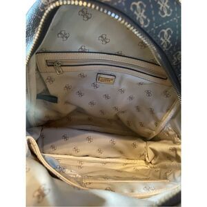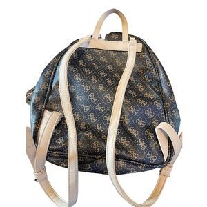 GUESS Rylan Backpack 10.75"W x 9.5"H x 6.25"D Silhouette is based off 5'9" model Zip closure 2.75" handle; 15.75" straps Pale Shiny Gold hardware 1 zip around front pocket 1 zip pocket, 3 slip pockets 2.2 lbs Faux leather MPN: SG786733 Size: one size Color: dark brown almost black/ tan Age Group: adult Gender: female Material: Faux leather