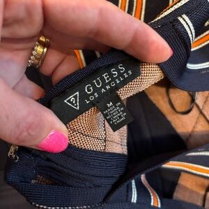 Brand new with tags! Striking GUESS bodycon dress featuring a bold crisscross halter neckline with orange, white, and navy stripes, paired with a classic navy bandage skirt. This figure-hugging dress is ultra-flattering and perfect for a night out, date night, or any occasion where you want to stand out.