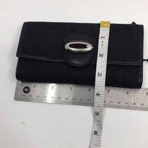 New with tags Guess Timeless Edition SLG black canvas and faux leather trifold three-quarter length wallet. Measurements are in photos. Brushed nickel silver toned hardware. Faux vegan leather trim and interior. The only flaw that I see on this wallet is a very faint light stitch on the front of the wallet. Not exactly a “flaw”, but definitely worth noting. Looks like this was probably a small imperfection from the manufacturer. Slim profile makes this the perfect wallet to fit in most compact bags. And color goes with everything. Color on the tag is Coal.