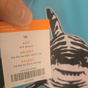 New with tags, this long sleeve rash guard from Gymboree is perfect for your little one's water adventures. The vibrant blue top features a striking black and white shark graphic on the front, sure to be a favorite. It boasts SPF 50+ sun protection, making it ideal for the beach, pool, or any outdoor activity. The contrasting dark blue raglan sleeves add a stylish touch. This is a new, unopened item with original tags. Overall length 22.5'. Pit to pit 14'. Size 10.