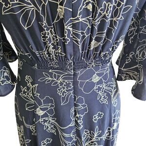 - White florals with ruffled elbow sleeves and V-neck faux wrap neckline.