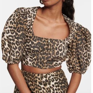 This crop top from Ganni features an all-over leopard-print that is sure to make a bold statement befitting any confident dresser. The cotton design comes with short puff sleeves and a front-zip closure.
