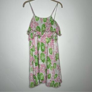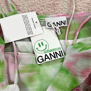 New Ganni crinkle micro pleated ruffle mini slip dress. Charming dress with green and pink floral pattern on an off white background. Perfect for a breezy day.