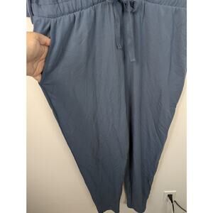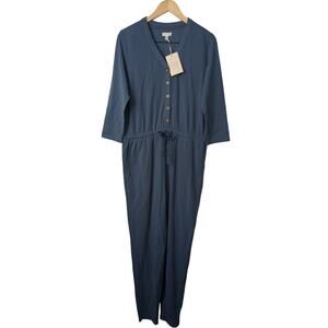 NWT Garnet Hill Blue Traverse Knit Jumpsuit. V-neck, 3/4 sleeves, button top, drawstring, pockets, tapered legs, comes with extra button.