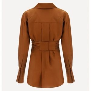 NWT Gauge81 Sabinas Silk Blouse in chestnut. Wrap styling with hidden back hook and eye closure. Low collar. Surplice cropped front design. Shirttail hem. Buttoned cuffs. 100% silk. Made in Portugal. Dry clean. Please see size chart in photos, as this is still packaged in plastic. Size extra small.