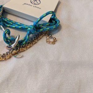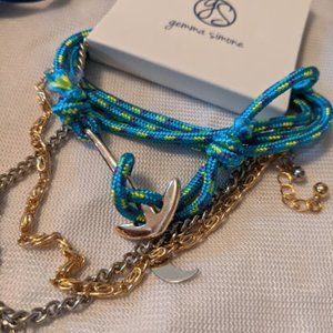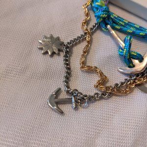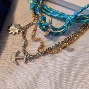 Brand new never worn Gemma Simone 3 piece bracelet set. These bracelets all have a nautical theme to them. One is made out of a turquoise blue nylon material and has a silver anchor has a clasp. There is one silver and one gold chain bracelets that have nautical charms on them, including an anchor, moon, and sunburst charms. Comes with a pouch perfect for gifting and organization!