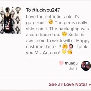 This tank is absolutely Stunning with the American Flag Hand giving the peace sign with silver sparkly gems placed as jewelry on the fingers, the fingernails are also covered in the sparkly gems as well. This beautiful design against the black makes it really pop & stand out! It's hard to see in the pictures how much it sparkles, but it's so beautiful in person! One of my favorite pieces by far! The material is very light and slinky, perfect for summer! Brand New With tags! Smoke free home.