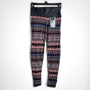 NWT Geometric Aztec Ethnic Boho Print Faux Leather Waist Multicolor Leggings