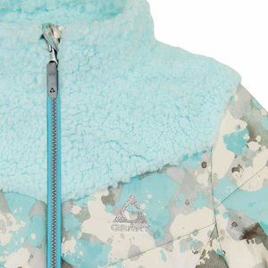 Multi colored splatter design with blue plush accent inner layer jacket or multi colored tie dye with white plush detail inner layer jacket