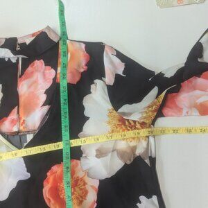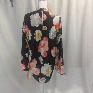 Choker neck with deep plunge, and a deep keyhole back with 2 buttons securing it. Huge, bold flowers on this semi-sheer black fabric, bell sleeves, and a high/low hemline. Beautiful top to welcome in the Fall.
