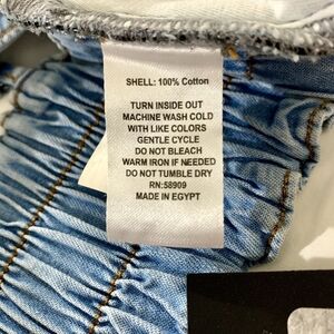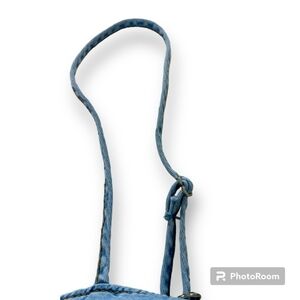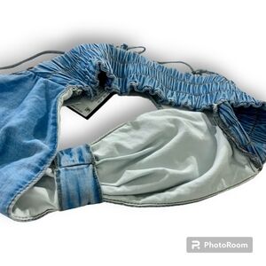 denim, fully lined, elastic back, pleated bow-like detail, adjustable straps.