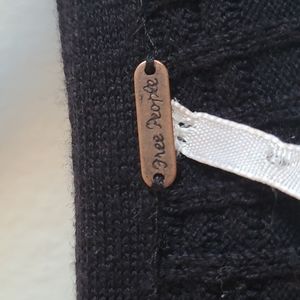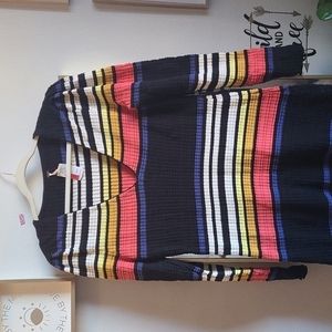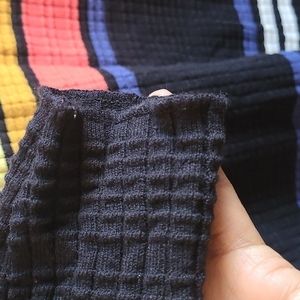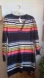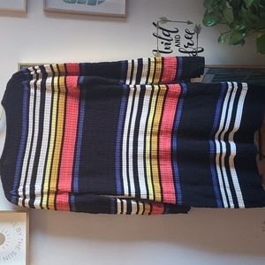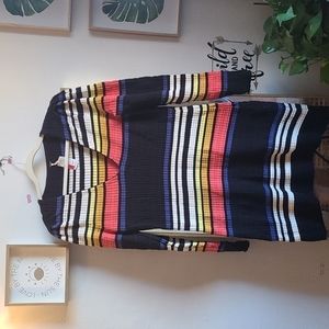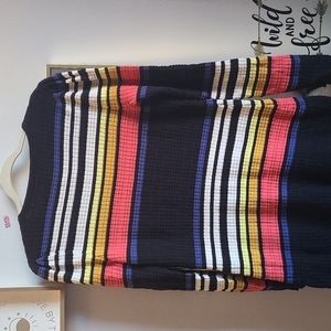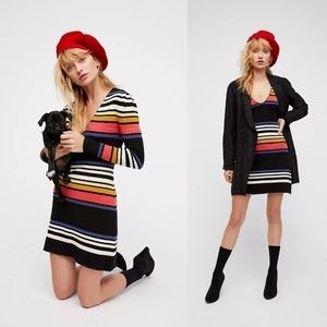 Long sleeve ribbed sweater mini dress in a multi-color striped print.