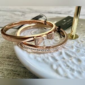 NWT! ♠️ Set of 2 kate spade bangle/bracelets. Beautiful rose gold tone pave crystals. Brand new with tags. Includes kate spade exclusive pink and green gift box.