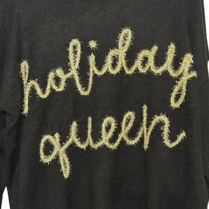 Gilli plus size holiday knit sweater size 1X. This is perfect for any holiday queen out there. So soft and comfortable. Black knit sweater with “holiday queen” in gold tinsel scripted letter detail on the front. Long sleeve and crew neckline. Hits at about the hips. 52% acrylic, 30% nylon and 3% spandex. Brand new with tags! Perfect for holiday parties! Measurements: length- 27 inches and Chest (underarm to underarm)- 26.5