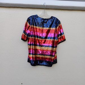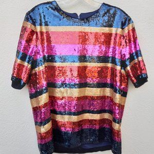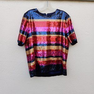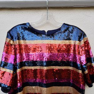 Light up a room in this multicolored striped sequined top. Short sleeves. Stripes of navy blue, pink, red, and gold in varying widths. Zip back with hook and eye closure. Lined. New with tags attached. NWT Trina Turk Size XL orig. $398 Stripes, celebrate, celebratory, holiday, christmas, new year's eve, party, cocktail, event, shine, shiny, metallic, opulence, preppy, classic, ralph lauren kate spade vibes